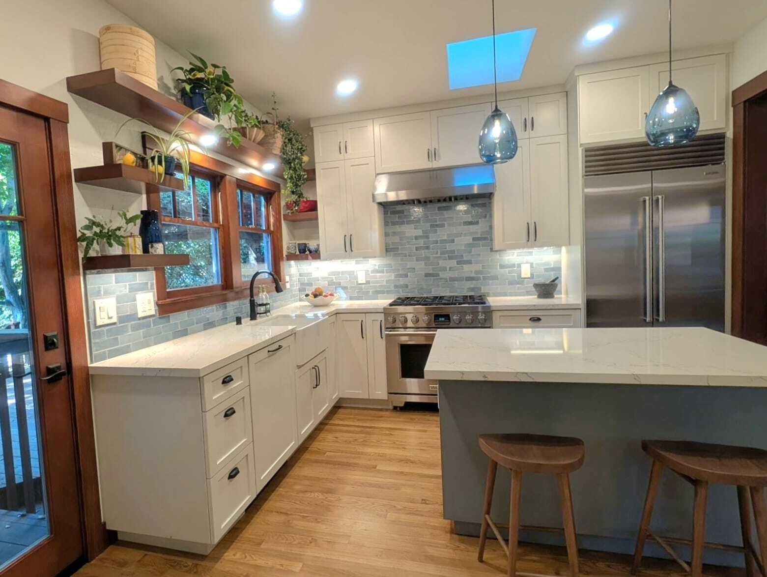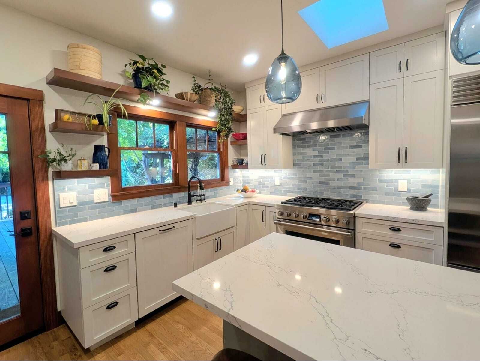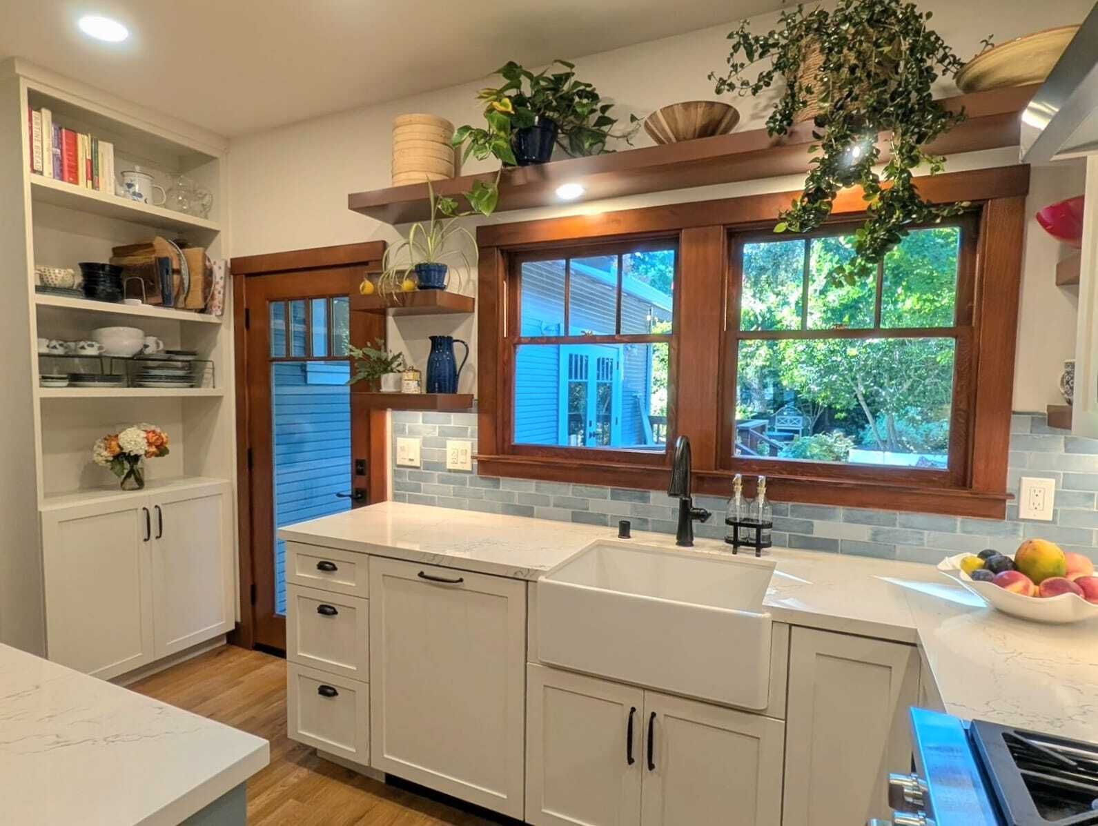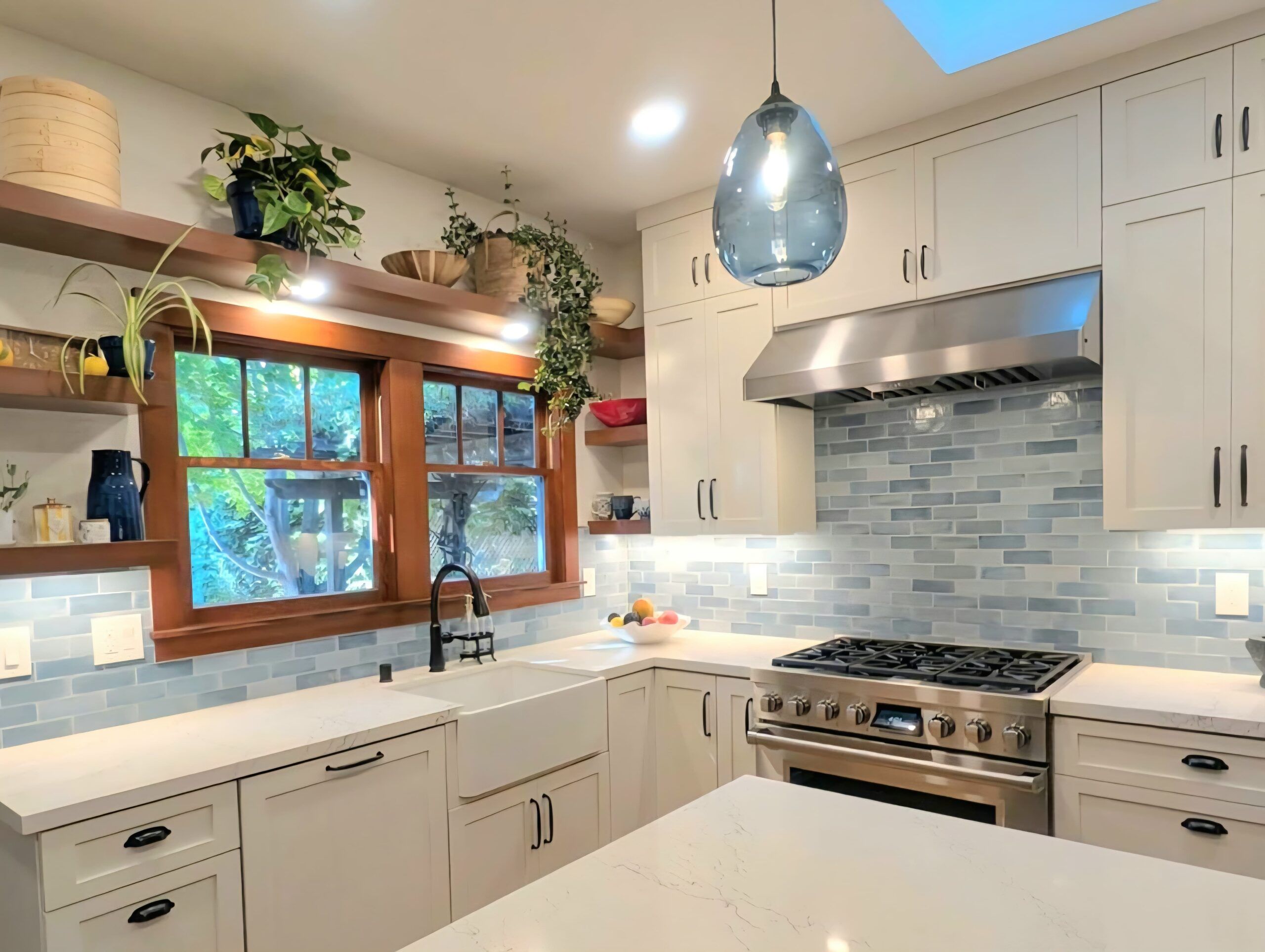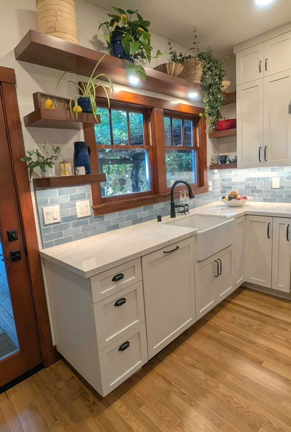 White shaker cabinets pair beautifully with soft blue glass tile and warm wood trim around the windows and door add contrast and character, grounding the space in a welcoming, natural aesthetic. Floating shelves and custom cabinetry provide flexible storage, while open shelving adds a touch of personality, allowing homeowners to display books, ceramics, and greenery.